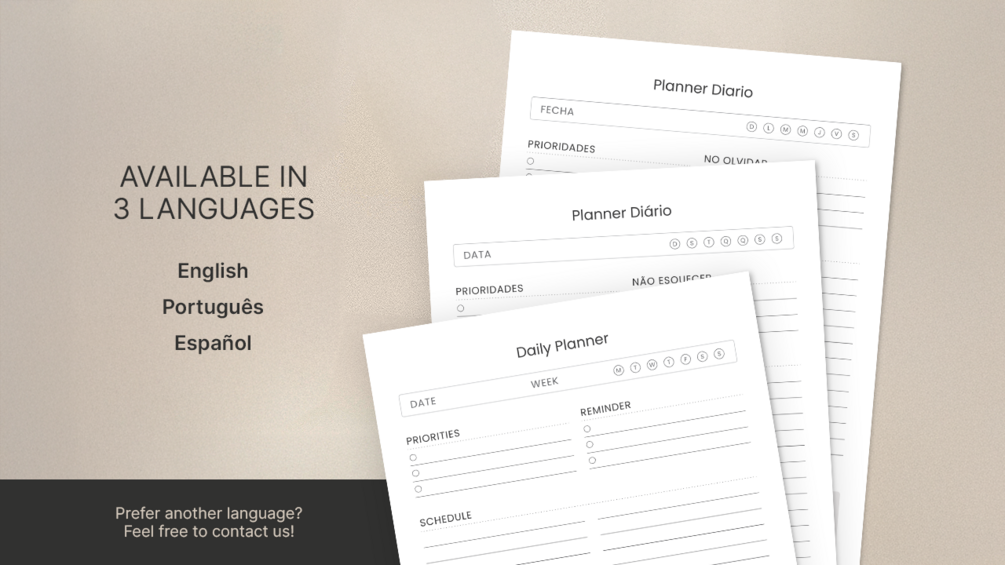 Stay organized with this minimalist, clutter-free Daily Planner, designed for anyone who wants a clean and functional way to structure their day. Available both for printing or digital use in three languages! (English, Português & Español)