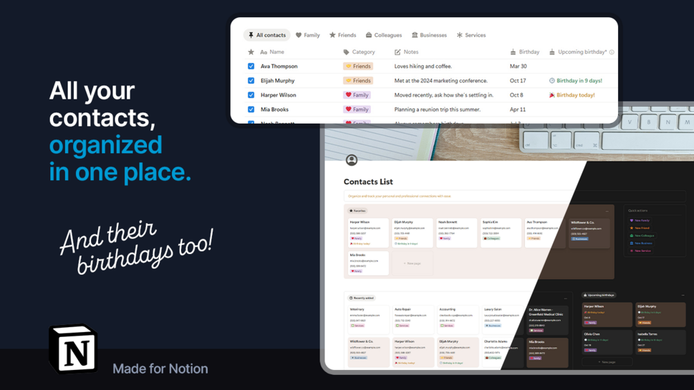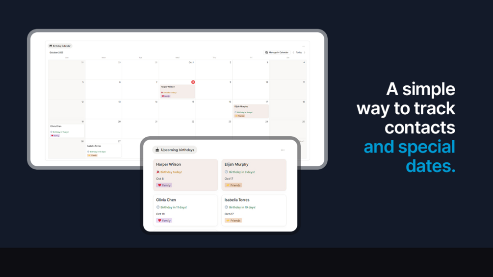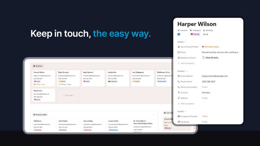 Stay connected to the people who matter most. Track birthdays, save contact details, and keep your network organized!